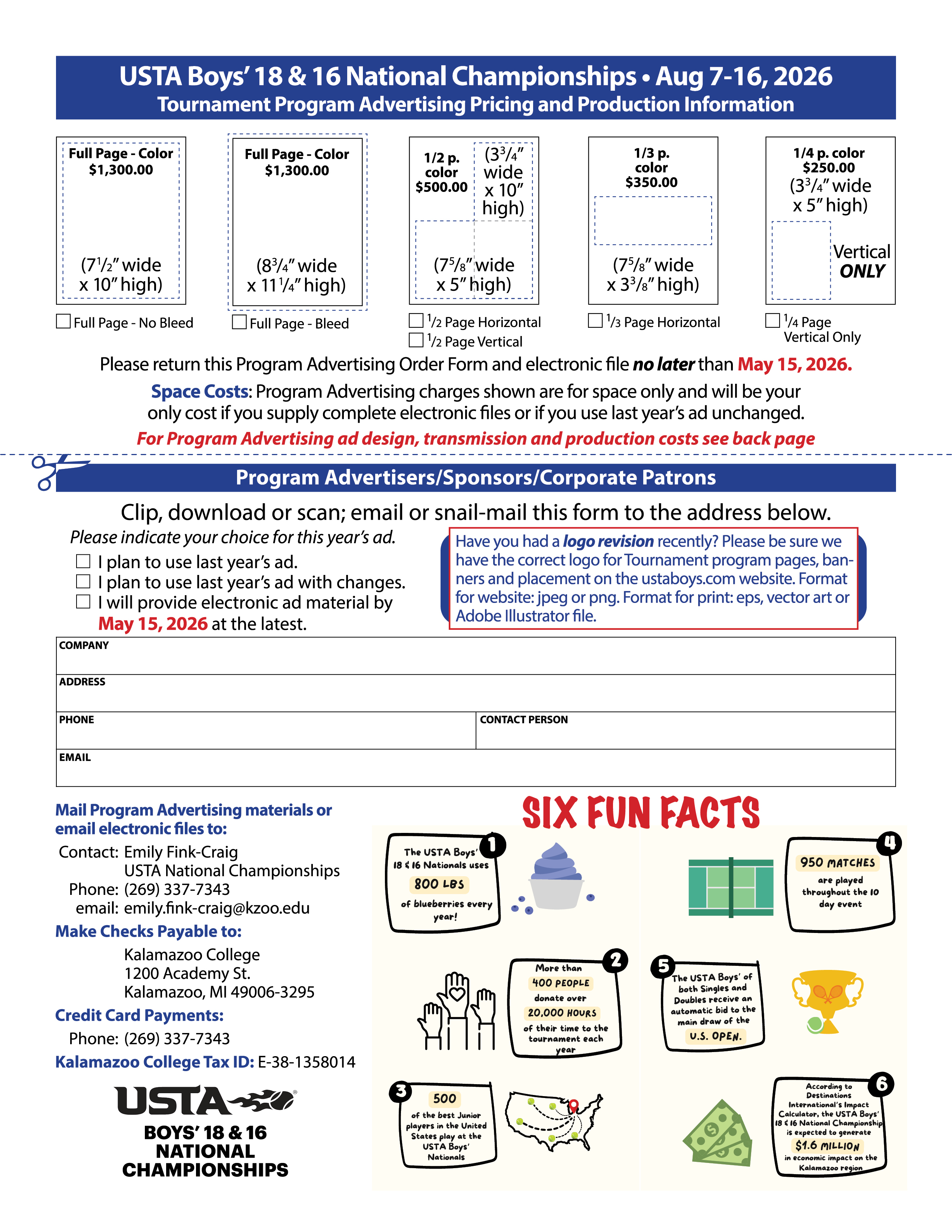 For $130.00* you can become a Patron of the USTA Boys' 18s & 16s National Championships in Kalamazoo. Patron privileges for the entire tournament include the Tournament Exhibition (when applicable), reserved seating under the canopy, reserved parking and your name printed on the Patron page in the tournament draw sheet. Please contact Emily Fink-Craig at (269) 337-7343 for more information.
