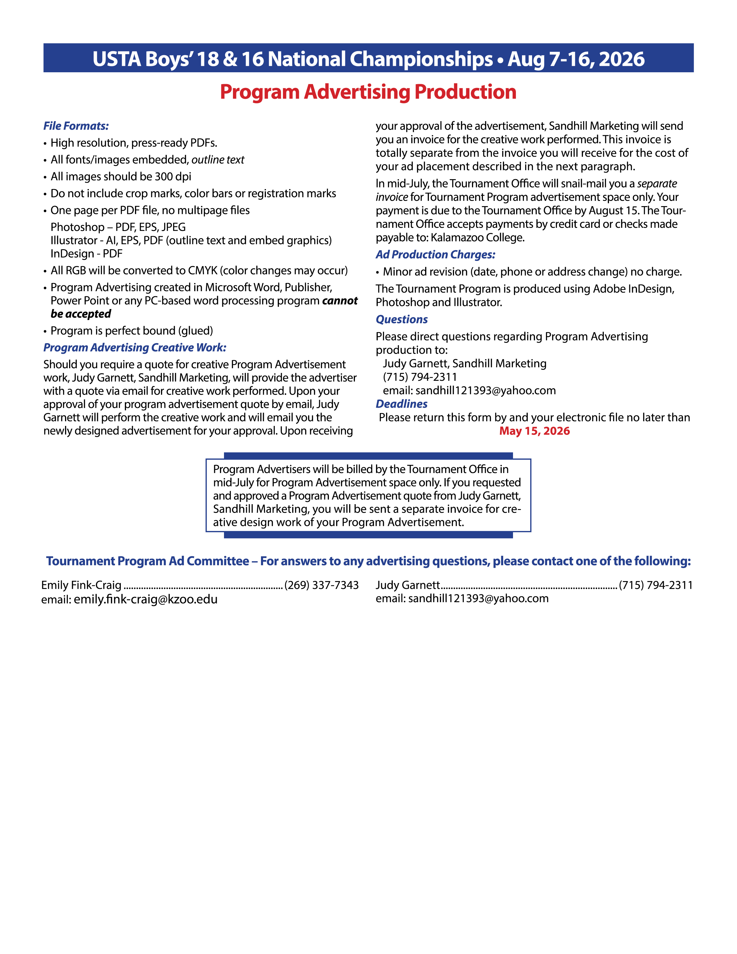 Advertising in the tournament program and/or draw sheet is a great way to get your company noticed by more than 20,000 spectators. Program Advertisers receive free weekly general admission tickets.